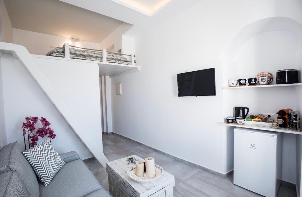 The interiors and exteriors of Alpha Living Suites are all dressed in lustrous white, in line with typical Cycladic architecture, albeit in the most colorful spot of the island. A soothing white color palette dominates the interiors with earthy, refined touches of color here and there, characterized by a boho-elegance that is unmistakable, promising a truly sensational and hospitable environment.